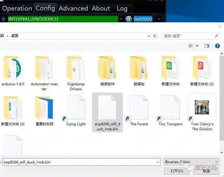 bin 的文件接下来我们就用 esp8266 的烧写固件的软件进行烧写。打开软件插上 esp8266 先在 Operation 中选择端口然后再去 config 里面选择我们刚刚下载的固件进行烧录