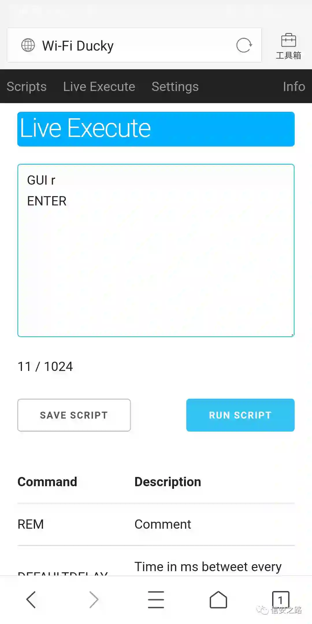 当我们插上电源的时候 ESP8266 会发射出一个叫做 WIFI DUCK 的 SSID 连接密码是 quackquack,连接上了以后打开浏览器登入后台 192.168.4.1 中进行控制我们会发现有三个界面第一个的界面就是 badusb 的脚本界面,这控制界面是给你提前写好的脚本进行上传用的总共能上传 482KB,