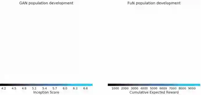 运用种群算法,我们在CIFAR-10数据库训练GANs和Ms Pacman数据库训练Feudal Networks (FuN)的变化情况。粉红色的点代表初始状态,蓝色的店则代表最终状态。