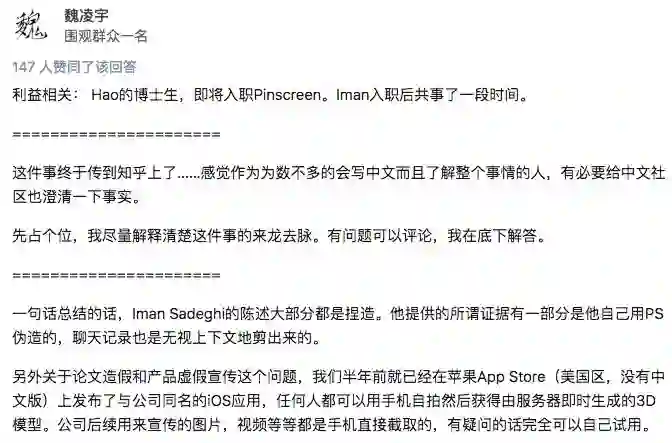 知乎上一名自称黎颢博士生、即将入职Pinscreen的“魏凌宇”曾与Sadeghi入职后共事了一段时间。他认为Iman Sadeghi的陈述大部分都是捏造。“他提供的所谓证据有一部分是他自己用PS伪造的,聊天记录也是无视上下文地剪出来的。”