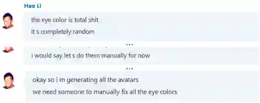 2017年1月22日,在Sadeghi签署加入Pinscreen的合同之前,黎颢通过Facebook消息以书面形式向他发送了两个据称自动生成的虚拟形象的例子。 Sadeghi特别询问是否自动生成了头像,黎颢明确回答“是”。