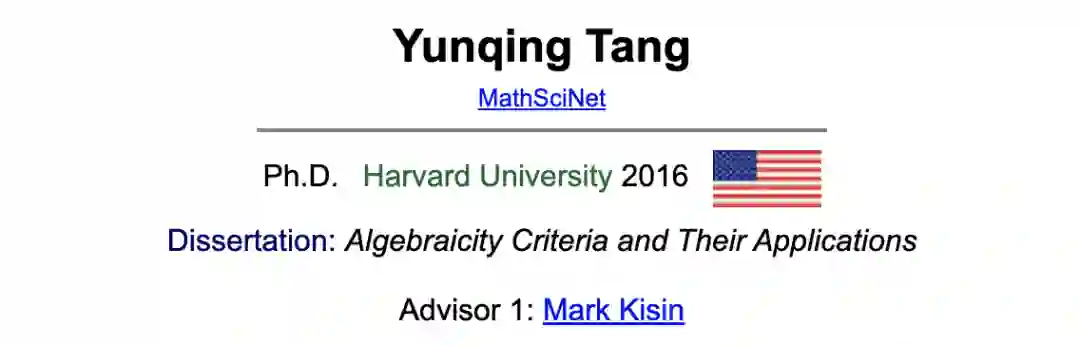 曾由「莙政基金」资助,在田青春老师指导下进行代数几何及代数数论方向的科研工作。
