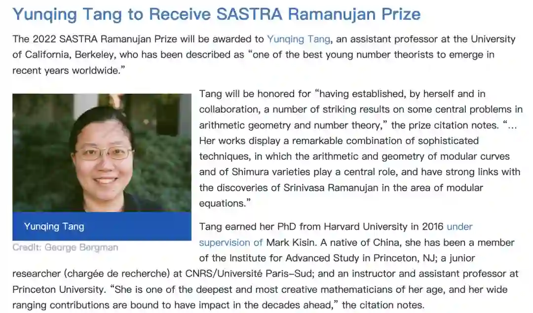 10月3日,北大数院07级院友、加州大学伯克利分校助理教授唐云清被授予2022年度SASTRA拉马努金奖,表彰她在算术几何和数论方向取得的显著研究成果。