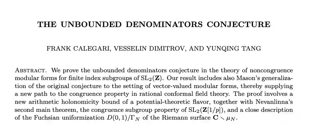 而最新相关以及最具代表性的工作,就是今年同合著者一起成功证明了非同余子群无界分母猜想。