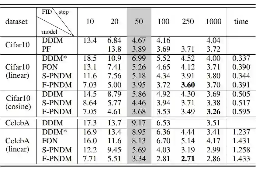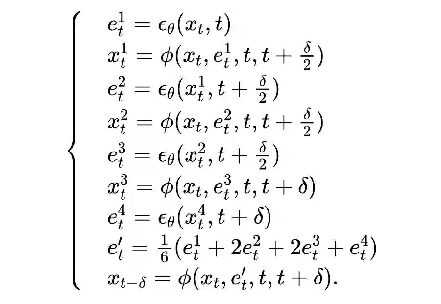 这也很大程度上解决了第二个问题,因为不需要整体改变迭代公式,这保证了迭代生成的轨迹和原始 DDIM 迭代公式相似。而 DDIM 的迭代公式恰恰可以保证生成数据和训练数据符合相同的分布。因此迭代过程可以大概率落在训练数据集中的高密度区域,不会跑出原始数据分布。先连续化再离散的策略则破坏了这种一致性,这也是 DDIM 能好于直接套用四阶数值方法的原因。