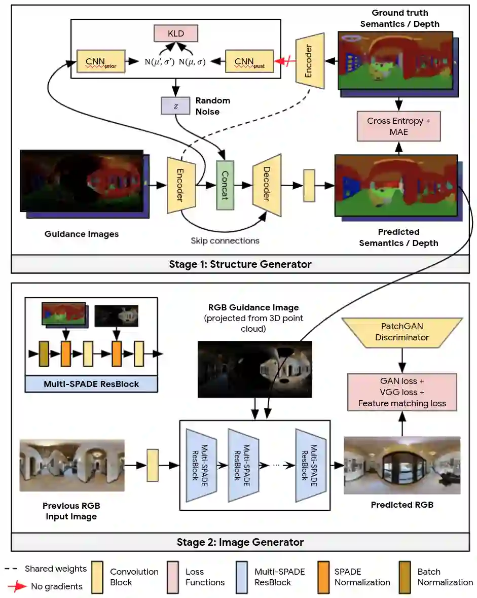 为了将指导图像转换为逼真可信的输出,Pathdreamer 工作方式分为两个阶段:第一阶段是结构生成器创建语义分割和深度图像;第二阶段是图像生成器将这些图像渲染到 RGB 输出中。概念上来说,第一阶段可提供场景的高水平可信语义表示,第二阶段将把这些表示渲染为逼真的彩色图像。两个阶段均基于卷积神经网络。