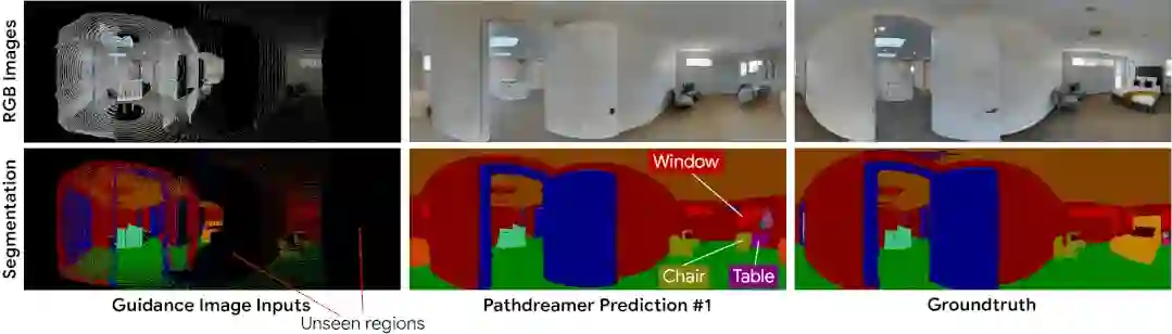 Pathdreamer 能够为很难确定的区域生成多种可信图像。最左列的指导图像表示智能体先前检测到的像素。黑色像素表示先前未检测到的区域,Pathdreamer 会通过对多个随机噪音向量进行采样为此类区域渲染出多种输出。在实践中,生成的输出可利用智能体探索环境时新观察到的结果