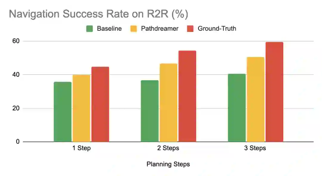 在 Pathdreamer 场景中,以三步的距离(约 6 米)进行提前规划时,VLN 智能体可实现 50.4% 的导航成功率,远高于基线场景中不借助 Pathdreamer 时40.6% 的导航成功率 。这表明, Pathdreamer 会对关于室内真实环境有用且可访问的视觉、空间和语义线索进行编码。作为完美世界模型的能力上限,在 Ground-Truth 场景中(通过移动进行路线规划),智能体的成功率为 59%,尽管我们注意到此场景需要智能体花大量时间和资源用于真实探索多种轨迹,而这在真实场景中由于代价太高而几乎不可行。