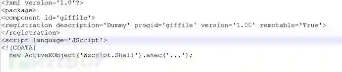 如果将COM 接口注册PSOAInterface或者PSDispatch后,oleaut32.dll 会查找注册的Type Library信息(存放在注册表中),如果找到的话,将调用LoadTypeLibrary 来加载 Type Library. TypeLibrary在加载的时候,有个很有趣的行为: 首先会按GUID查找,如果查找失败的话,会按文件名来查找。如果按文件名查找也失败的话,这时会按照Moniker 来查找。这时,我们只需将包含scriptlet的Moniker注入到一个Type Library 文件中。就可以执行这段scriptlet。漏洞发现者采用的ScriptLet如下图所示。