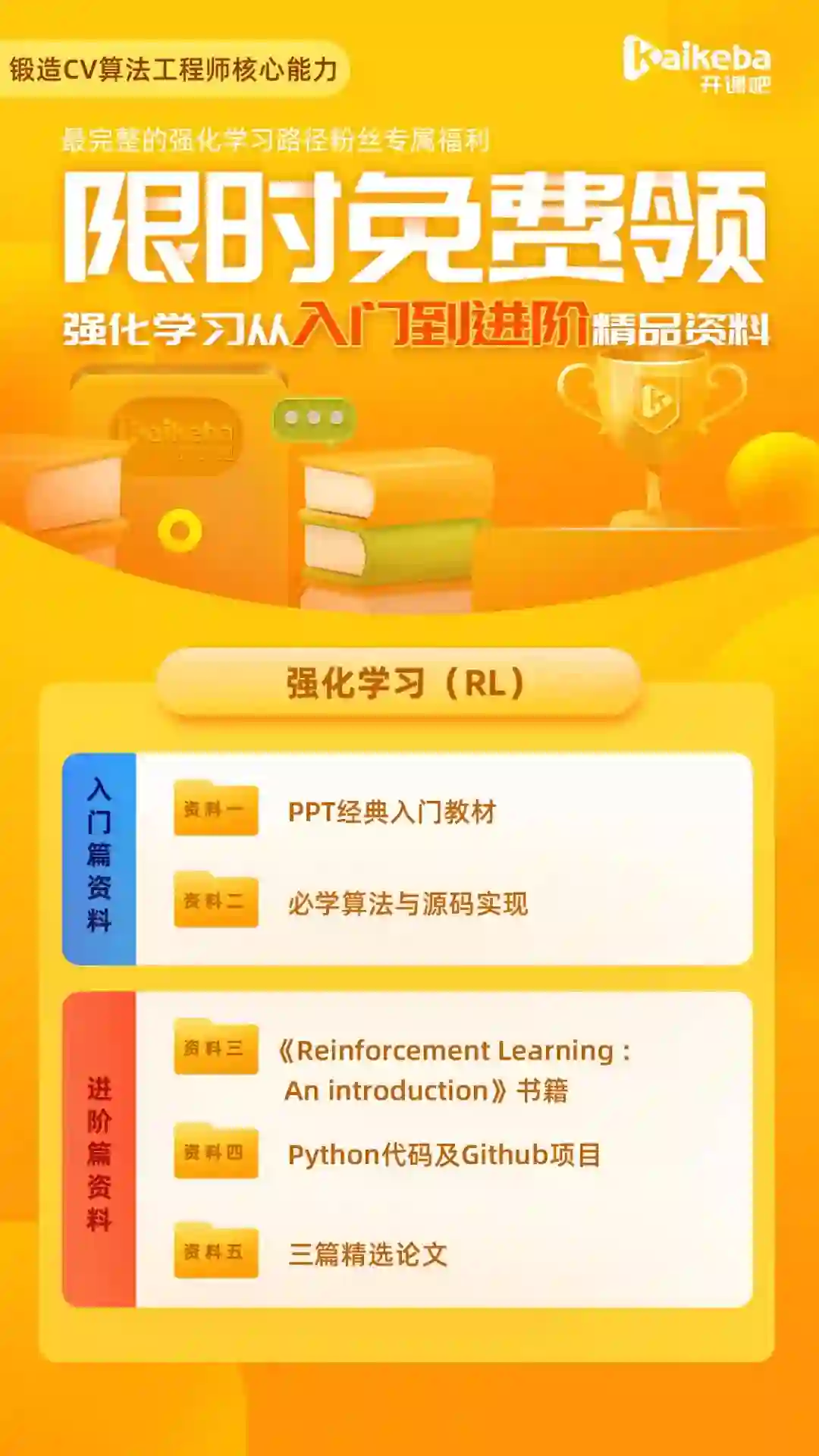 这套全阶段强化学习资料,现在免费送给大家学习,本号目前 限时免费领取,想要从事强化学习深入研究、提升自己、冲击高薪的小伙伴抓紧时间,速速领取。