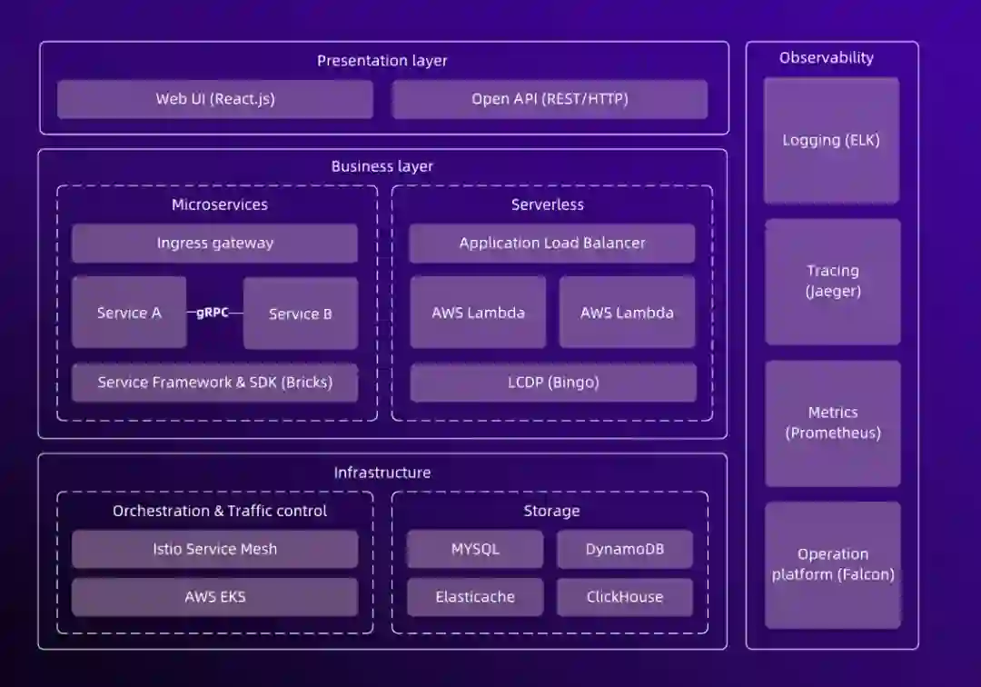 下图展示了目前核心业务系统的架构形态,准确来说我们的应用已经发展成为一个微服务加无服务器的混合云原生架构,并通过 Kubernetes 和 Istio 完成应用编排管理和服务治理工作。