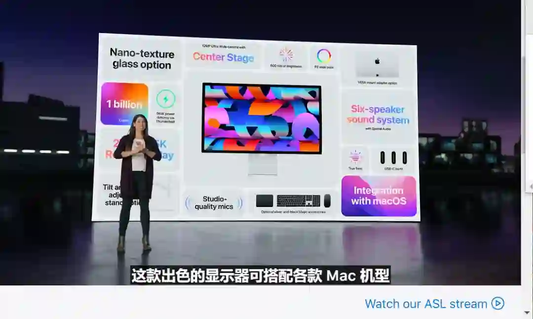 苹果同时发布了显示器Studio Display,27英寸超大屏幕,147万像素5K视网膜显示屏,支持600尼特亮度,支持原彩显示。它内含A13芯片,配置1200万像素超广角摄像头,首次支持人物居中。它配置录音棚级别麦克风,高保真六扬声器音响系统,支持空间音频。显示器背后3个USB-C接口,一个Thunderbolt接口,可以为MacBook Pro快充,同时连接3台显示器和一台笔记本,它的价格11499元起。