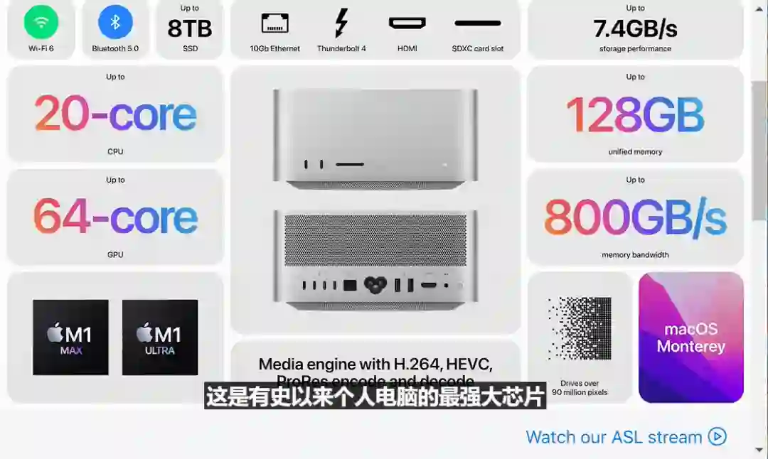 M1 Ultra采用突破性的晶粒到晶粒的技术,多晶硅架构UltraFusion使晶粒密度可达到现有技术的2倍,传输速度高达2.5TB/s,实现低延迟、超高带宽和高能效。M1 Ultra有1140亿个晶体管,是M1的7倍。面积显著增大,具备800GB/s内存通道,128GB统一内存。它拥有20核CPU和16个高性能处理核心,64核GPU,比M1提升8倍速度,媒体处理器引擎性能是M1的2倍。在高性能之下,M1 Ultra性能功耗比如今16核电脑能耗低90%。