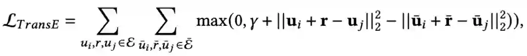 将知识图谱嵌入融入文本生成 知识图谱提供了不同实体节点之间的连接信息,因此知识图谱嵌入可以刻画实体节点之间的语义关联。基本的想法是将实体和关系映射到低维向量空间 (其中 ),这样可以减少数据唯独,同时保持知识图谱潜在的结构信息。在知识图谱嵌入中,TransE是其中广泛使用的方法,给定一个知识图谱边 ,可以看做是从头实体以很小的误差经过关系“翻译”到尾实体,即 。知识图谱嵌入一般采用基于margin的优化目标,因此需要构建负例集合,采取的方式是随机选择一个实体替换三元组中的头实体或尾实体,最后通过随机梯度下降和L2正则优化: