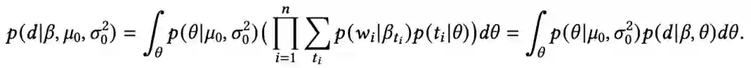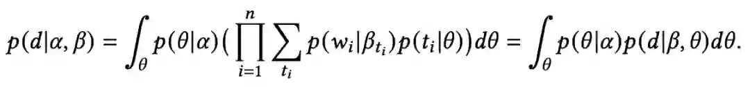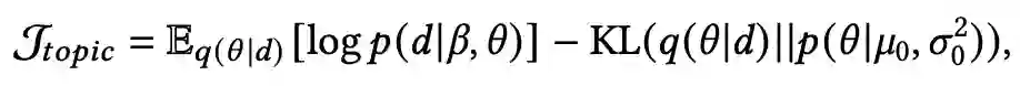 使用变分推断,利用神经主题模型增强文本生成 神经主题模型结合了神经网络和概率主题模型两者的优势,可以通过反向传播进行训练,并且很容易适应不同的上下文信息。在主题模型中,文档中的主题满足多元正态分布,主题中的单词同样也满足多元正态分布。为了促进主题模型中的推断,狄利克雷分布可以作为先验分布生成文档的多元正态分布中的参数 。因此,LDA中的生成过程可以表示为:(1) ;(2) ;(3) ,其中 表示文档bag-of-words表示, 表示单词 的主题, 表示在给定主题 下单词的分布。文档 的边缘似然函数为: