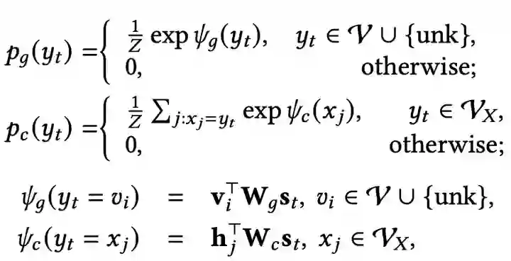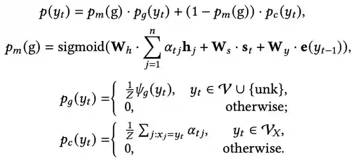 其中 是全局词典, 是输入序列的词典, 是unknown token。论文[3]提出了Pointer-Generator,与CopyNet不同,Pointer-Generator显式地计算生成模式和拷贝模式之间的转换概率 ,并且将注意力分布作为拷贝概率使用: