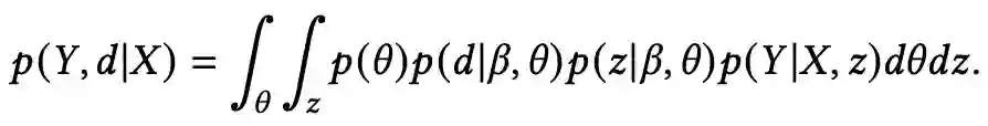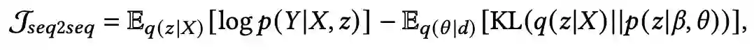 其中 T 是主题个数, 和 是多层感知器。具体来说,TGVAE将输入文档的bag-of-words映射为主题向量,然后使用主题向量重构得到bag-of-words,并且TGVAE会学习每个主题上的单词分布,这个分布会作为一个主题依赖的先验分布生成最后的文本 。因此,关于文档 和输出 的联合边缘似然函数为: