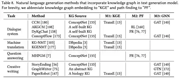 跳路径指的是从实体 出发,按照关系 连接而成的实体关系序列。下图8列出了目前将知识图谱融入文本生成任务的模型。