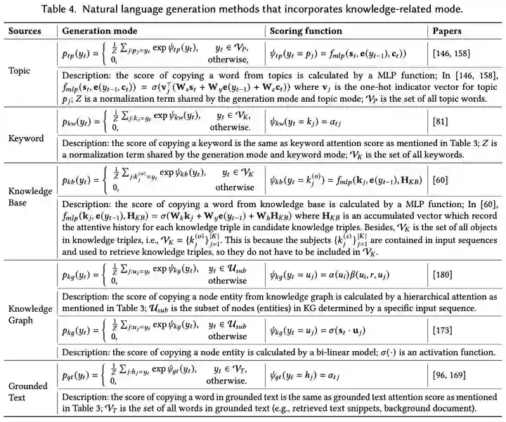 下面介绍几种广泛用于将知识融入生成模型的方法,包括注意力机制,拷贝机制,记忆网络,图网络和预训练模型。