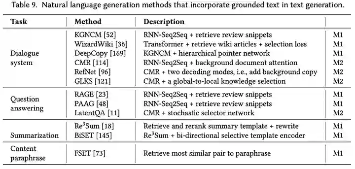 这里的文本指的是与输入序列相关,能够提供额外知识的文本,称为knowledge grounded text。这些文本不会出现在训练语料和结构化库(例如知识库和知识图谱)中,但是可以从在线资源中获取大量相关文本。这些在线资源包括百科全书(例如Wikipedia),社交媒体(例如Twitter),购物网站(例如Amazon reviews)。这些文本对于理解文本语义和上下文语境发挥重要的作用。例如,Wikipedia文章可以提供关于输入文本的解释和背景信息,Amazon reviews包含了许多商品相关问题的答案和意见,Tweets提供了关于某个事件人们的看法和观点。因此,这些文本通常会作为重要的知识信息帮助文本生成任务。下图9总结了目前利用文本增强文本生成的代表性工作。