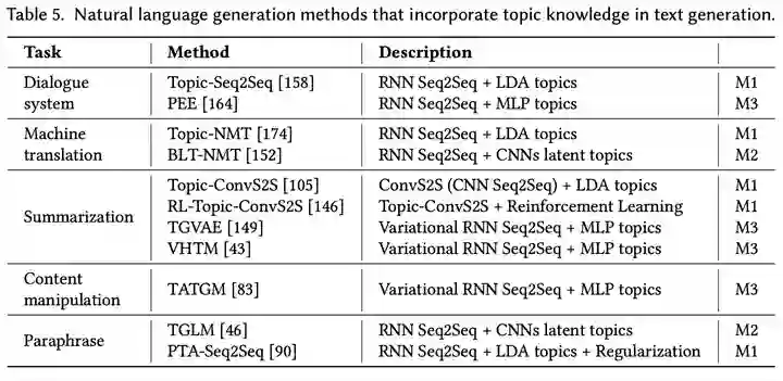 主题(Topic)可以看做是文本语义的高度压缩,可以用来保证文本的语义连贯性(semantic coherence),从而帮助文本生成。例如,文本摘要里通常要求生成文本准确把握输入文档的关键主题,对话系统里要求回复的文本与对话主题相关,避免生成无意义回复。近年来,许多研究将神经网络和主题建模技术(例如,LDA)进行结合,从文本中挖掘潜在主题。下图5展示了近年比较有代表性的基于主题增强的文本生成模型。