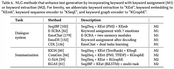 关键词(Keyword)通常是指一个或多个词,是关于文本重要内容的提炼。主流的关键词获取方法主要有两种:关键词分配(keyword assignment)和关键词抽取(keyword extraction)。关键词分配是指从一个可控的词表或预定义的分类系统中选择关键;关键词抽取则是从文档中抽取出最具有代表性的单词。关键词抽取技术(例如,TF-IDF,TextRank,PMI)近年来被广泛应用,文本生成任务也可以吸收关键词信息,保持文本的语义连贯性。其中,对话系统和文本摘要应用关键词知识较多的两个任务,下图6展示了对话系统和文本摘要基于关键词增强的文本生成模型。