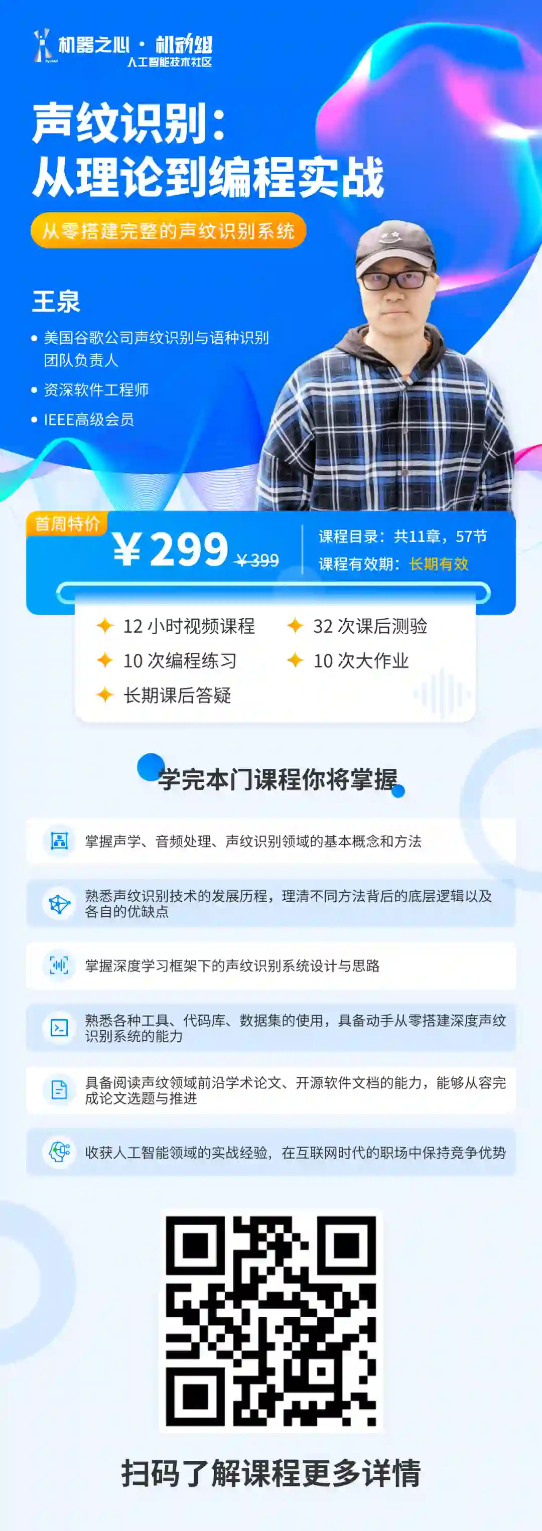 同时课程配有 32 次课后测验、10 次编程练习、10 次大作业,确保课程结束时可以亲自上手从零搭建一个完整的声纹识别系统。