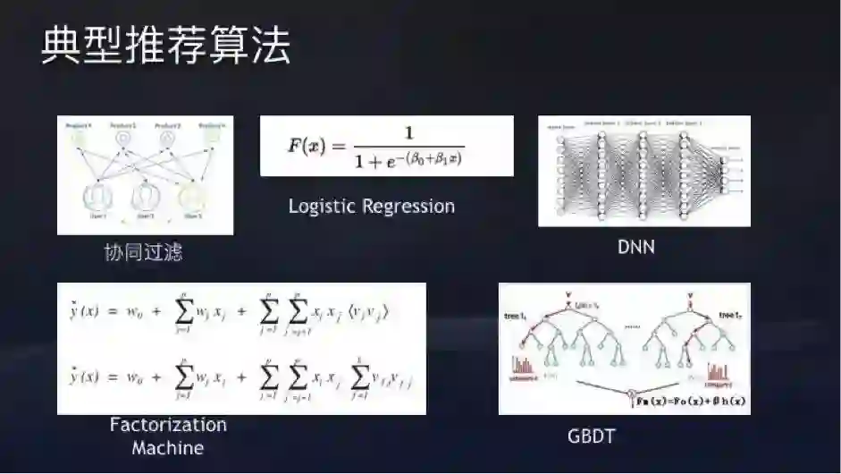 曹欢欢在现场的PPT里公布了头条使用的五种推荐算法,包括传统的协同过滤模型,监督学习算法Logistic Regression模型,基于深度学习的Factorization Machine,以及DNN和GBDT。