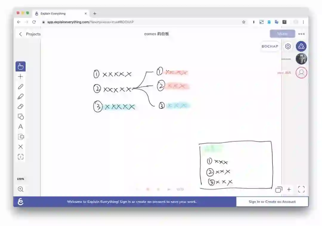 远程白板工具,我们可以将会议转化成一块共享的白板。然后再将这块白板分享给参与者,他们在 App 内输入分享代码,就可以加入参与编辑。