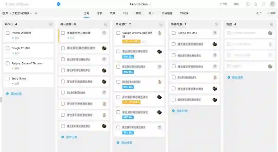 Teambition 是本土工具中,接近 Trello 功能又比较多的工具产品,发展了很多年之后,已经被阿里收购。本土工具的优点就是中文化和响应速度都很好,我派主要用来做目标管理和商务流程管理。它的特点是创建项目时提供了 40 多种模板,涵盖了产品研发、市场营销、行政人事等多个方面,每个模板都有已经划分好的任务流程,只要找到合适的项目就能快速创建项目并设置好任务列表。
