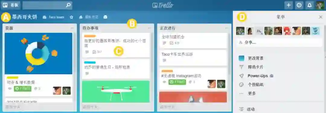 应该算是看板工具的鼻祖,以看板为主的项目和任务管理工具,同样简洁易用,且大部分功能是免费的,我派也在很早就启用 Trello 进行选题管理和稿件排期。它的特点是可以根据行业的需求进行工作流的灵活定制,包括市场营销人员、项目规划师、软件开发者、高校老师、人力资源经理、婚礼策划师、全职父母,还有旅游规划师等等,都在根据自身需求来个性化地使用 Trello 这一可视化工具。