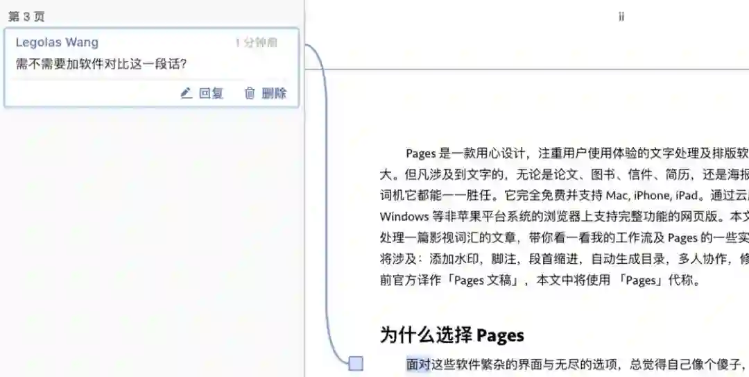 如果团队成员都是 Mac 电脑,其实 iWork 套件也提供了不错的在线协作功能。而 iWork 其实是首要保证文档的一致性,在不同的设备上都能保持一致,而且不需要使用者自己去调整,所以限制了一部分编辑功能(例如自动生成目录),也放弃了离线功能。再辅以之前提到的在「批准与修改」中的「接受或拒绝」修改的功能,尽可能避免了文档冲突这种烦心的情况出现。