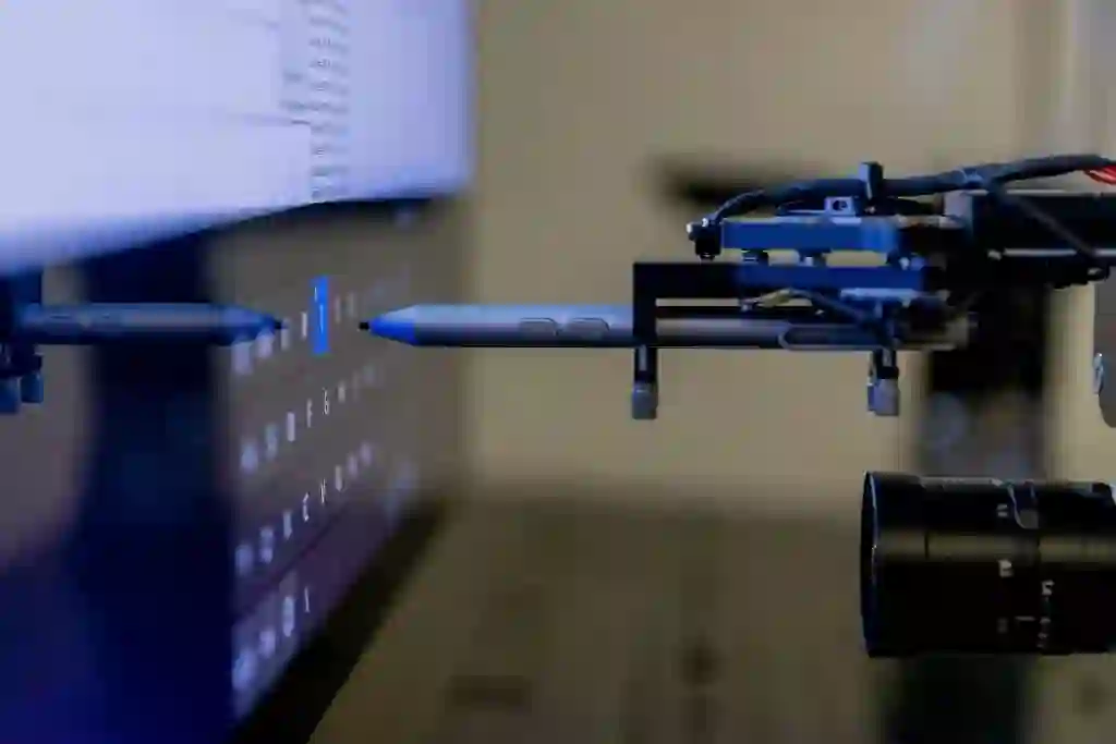 另一只机械手臂让 Surface 触控笔操纵设备:启动电源、待机、重启、按键、播放视频、传输文件、激活摄像头、拍照,不断重复。