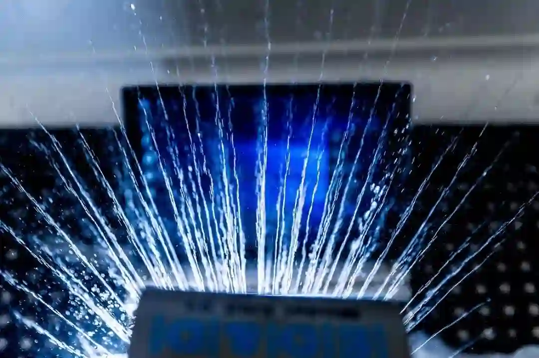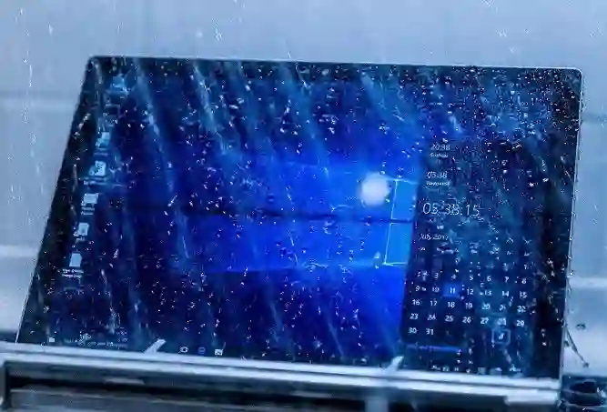 测试人员在 Surface 电脑表面喷水,模拟设备在整个使用寿命可能接触到的雨水。