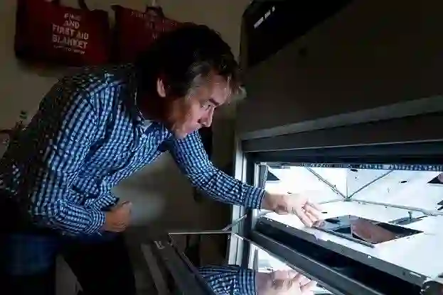 可靠性实验室经理 Bob Mcpherson 将 Surface 电脑放入模拟紫外线照射的机器中。