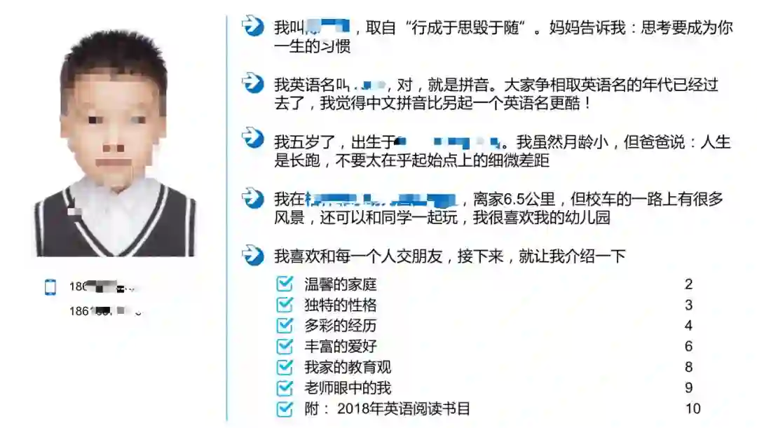 家长绞尽脑汁制作简历展示孩子的“优秀”,唯独伪装成孩子的口吻来叙述,“学龄前儿童制作”的简历里,放眼望去都是“我如何如何”,到处都是道理和大词的堆积,内容完全是大人的口吻,却要处心积虑以孩子的面貌来展示。其叙述风格甚至都不是“小大人”,矫揉造作到了“欲盖弥彰”的程度,完全看不到儿童的天真烂漫。我无法想象,家长这样做的时候可否有任何迟疑,未来要如何向孩子解释什么是“诚信”。