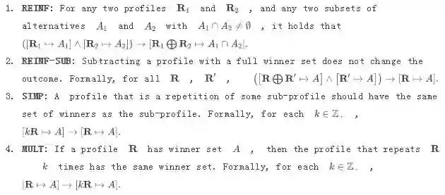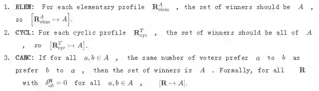 在这里提到的对称性、有效性公理和相容性公理是两个大类的公理。本文一大创新之处就是几类相似的公理给抽象出来。还是以 Borda 为例,我们使用了如下3个对称性、有效性公理: