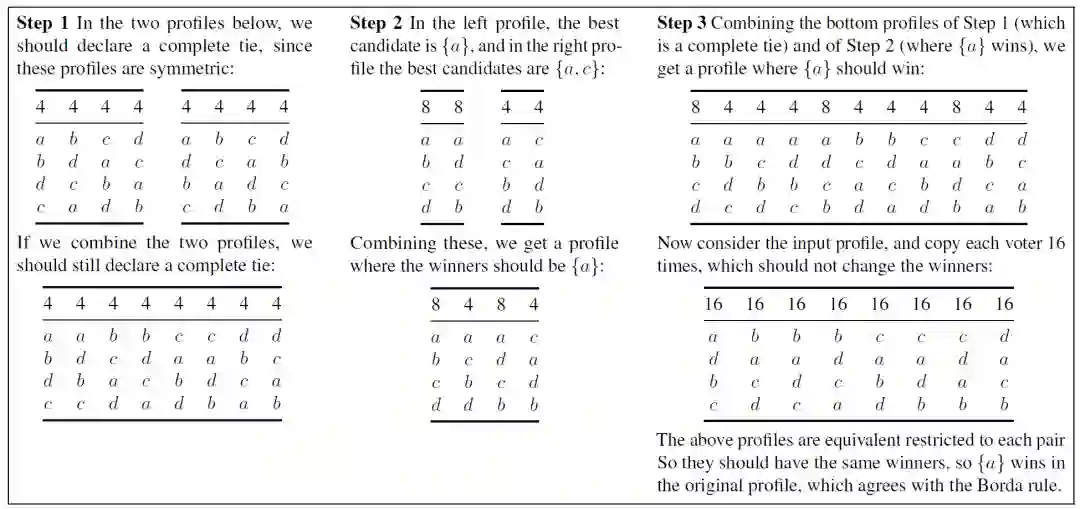 对于每个子输入,使用其于对称性和有效性的公理来得到相应的胜者。例如对于 (a, b, c); (b, a, c),由于在这个输入中 a, b 的位置是对称的,且严格优于 c,因此可以得到这个子输入的胜者应该是 {a, b}。