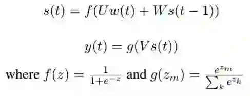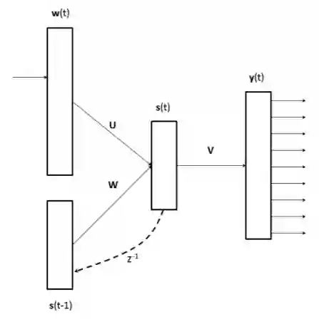 输入向量 w(t) 表示在时间 t 的输入词,使用了 1-of-N 编码,输出层 y(t) 可以得到词上面的一个概率分布。隐藏层 s(t) 维持一个对其句子历史的表征。输入向量 w(t) 和输出向量 y(t) 具有和词汇表一样的维度。
