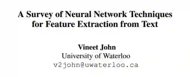 本论文的目标是促进有关使用神经网络架构的文本特征提取技术的讨论。本论文中所讨论的研究问题关注的是当前最佳的神经网络技术,它们已经在语言处理、语言生成、文本分类和其它计算语言学任务中被证明是有用的工具。