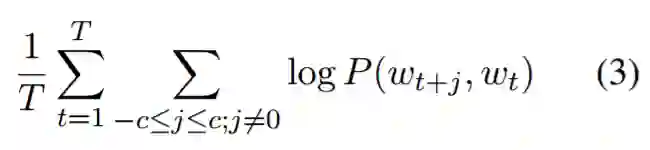 给定一个训练词序列 [w1, w2, w3, ..., wT ],该 skip-gram 模型的目标是最大化其平均对数概率,如式子 3 所示: