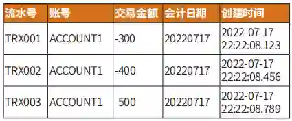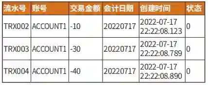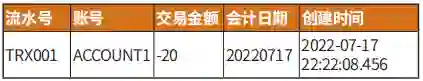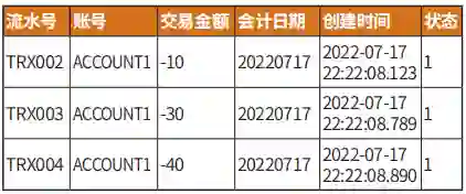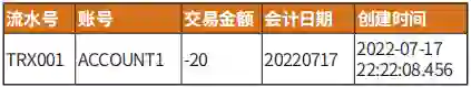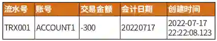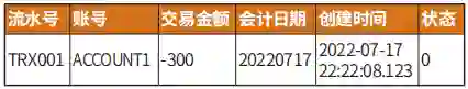 第一笔交易TRX001进来,扣账300,执行联机步骤完成后,数据情况如表9、表10所示。