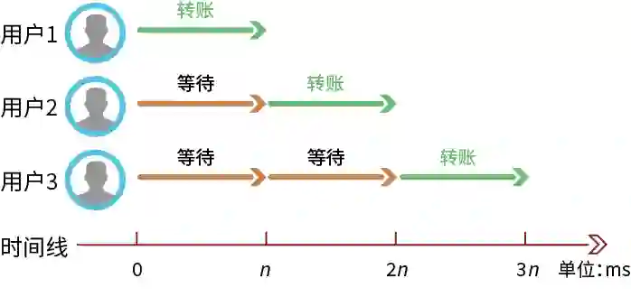 假如转账操作的平均耗时为n毫秒,用户1、用户2、用户3在0毫秒时同时要转账给同一账户,由于有事务控制,用户1在0毫秒时拿到账户操作权利,在n毫秒时转账结束,实际处理时间为n毫秒;用户2在0毫秒时要等待用户1事务结束,在n毫秒时拿到账户操作权利,在2n毫秒时转账结束,实际处理时间为2n毫秒;用户3在0毫秒时要等待用户1事务结束,在第n毫秒时要等待用户2事务结束,终于在第2n毫秒时拿到账户操作权利,在第3n毫秒时转账结束,实际处理时间为3n毫秒。
