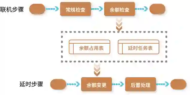 联机步骤执行成功,交易就可以认为成功了,只是交易资金临时放在延时任务表中,没有入账。延时步骤主要处理资金入账及相关后置操作。延时处理步骤是个定时任务,例如1分钟执行一次。下面具体介绍延时步骤每次被触发后的处理过程。