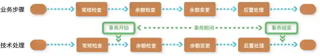 为什么支持热点账户的高频交易有一定难度?可以从金融交易的处理流程说起。如图1所示,金融交易的业务步骤一般为:常规检查、余额检查、余额变更、后置处理。其中,余额检查、余额变更、后置处理是对账户数据有变更操作的,计算机在技术处理上,为了保证交易的原子性、完整性、一致性,防止账务差错,就要加入事务控制。在一般的技术设计中,都是在余额检查前开启事务,在后置处理后提交事务。