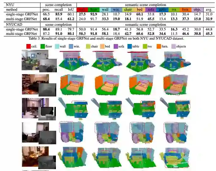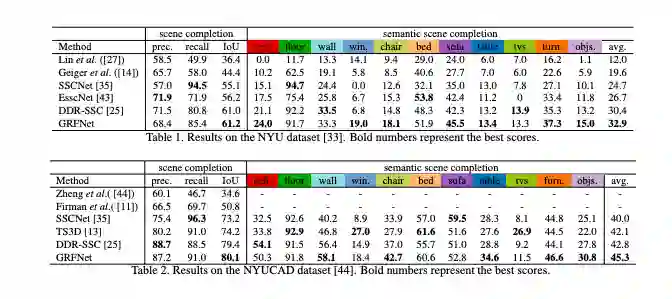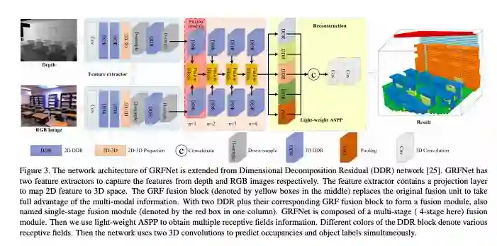 RGB图像包含对象的纹理细节,而深度图像能捕获与形状补全任务具有高度相关性的几何线索,因此同时使用RGB和深度图像可以进一步提高语义场景补全模型的精度。基于此,这篇论文提出了名为GRFNet的3D门控递归融合网络,该网络可以自适应地选择并通过使用门和存储模块来融合深度图像和RGB的相关信息。在单级融合的基础上,这篇论文还进一步提出了一种多级融合策略,可以对网络中不同级之间的相关性进行建模。在两个基准数据集上进行的实验证明了GRFNet在语义场景补全任务中进行数据融合优于现有的方法。