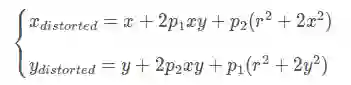 切向畸变是由于透镜本身与相机传感器平面(像平面)或图像平面不平行而产生的,这种情况多是由于透镜被粘贴到镜头模组上的安装偏差导致。畸变模型可以用两个额外的参数p1和p2来描述: