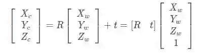 从世界坐标系到相机坐标系, 这是一个刚体变换,只需对世界坐标系的三维点作用一个旋转R和平移t(R,t即为相机的外参),变换过程可以通过一下公式完成: