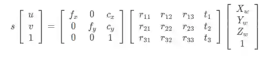 其中,s为缩放因子,A为相机的内参矩阵,[R t]为相机的外参矩阵,和