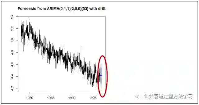 auto.arima函数会自动挑选一个最恰当的算法去分析数据;下图中蓝线是受访者政治倾向的预测,深灰色阴影区域为80%的预测区间,浅灰色阴影区域为95%的预测区间;电脑运行这段代码时速度可能会慢,请耐心等待: